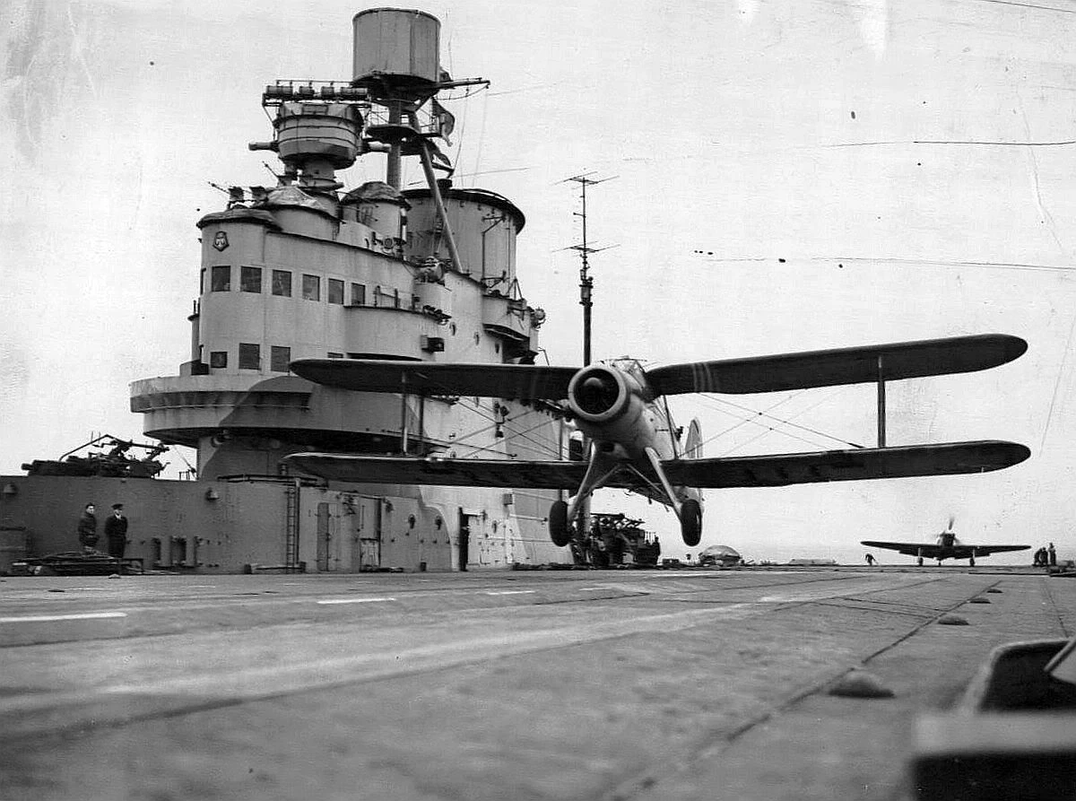 A Fairey Albacore taking off from a British aircraft carrier during World War II.