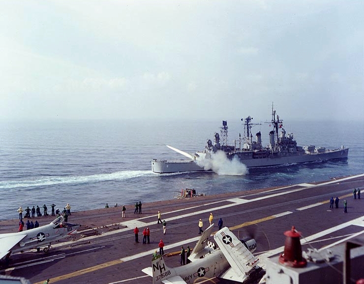 The guided missile cruiser APNS Topeka (CLG-8) fires a "Terrier" missile on November 18th, 1961 during weapons demonstrations for the Chief of Naval Operations, Admiral George W. Anderson.
