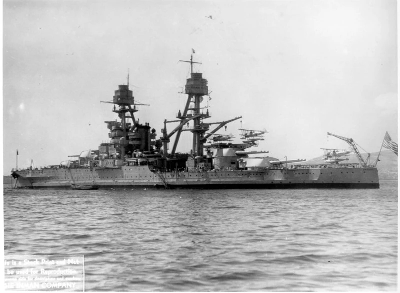 The Arizona at anchor in Halifax in late 1937, still flying the US Flag and with her original float planes on board.