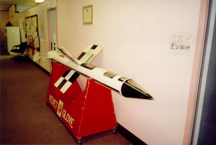 A scale model of the Velvet Glove air-to-air missile used in the Royal Canadian Air Force.